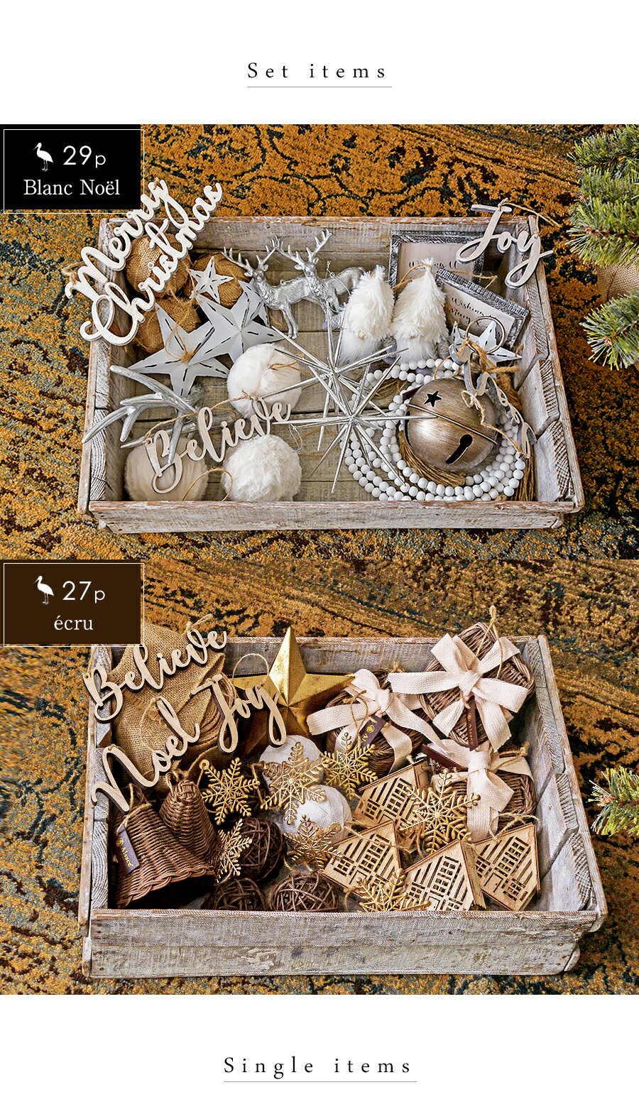 ここで紹介するオーナメントは、大鈴、角/鹿/星など単品で選ぶことができます